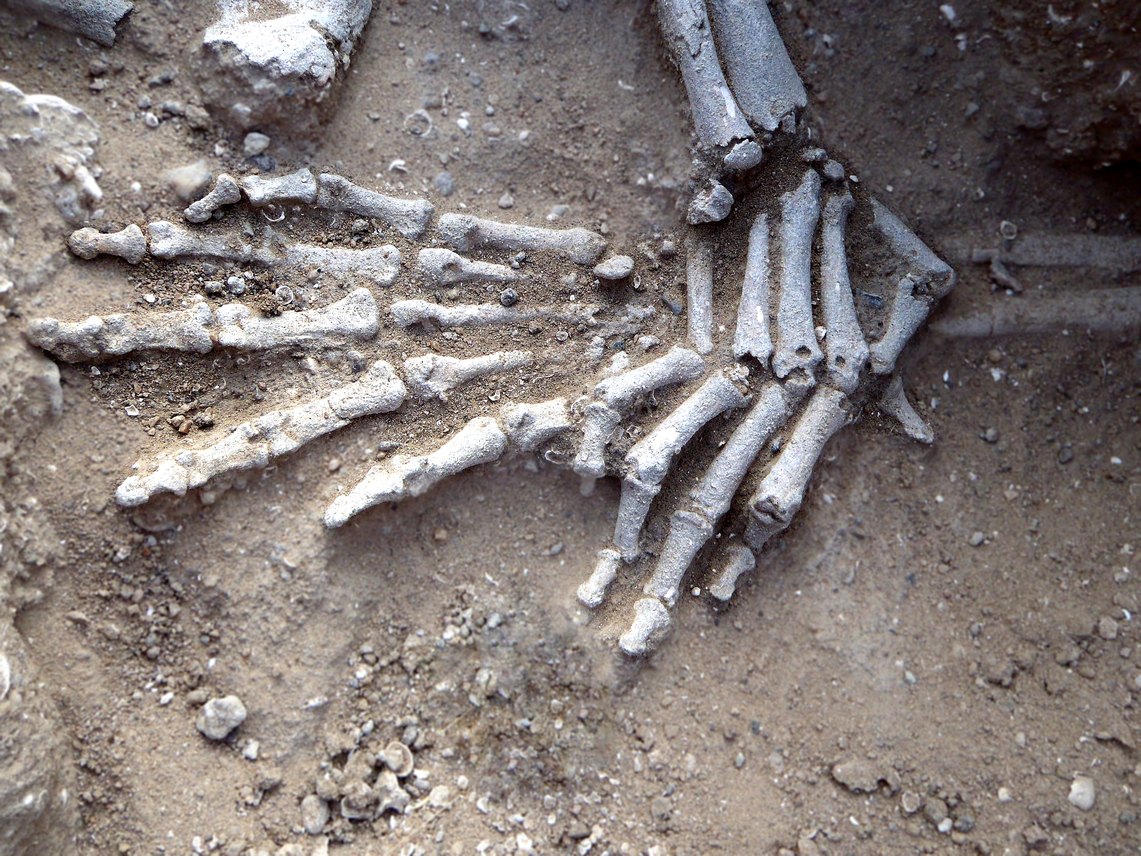 The remains of a 6-to-9 month-old fetus were recovered from within the abdominal cavity of one of the women, who was discovered in an unusual sitting position that suggested her hands and feet may have been bound. Three other skeletons were discovered in a position indicating their hands had probably been tied up as well.